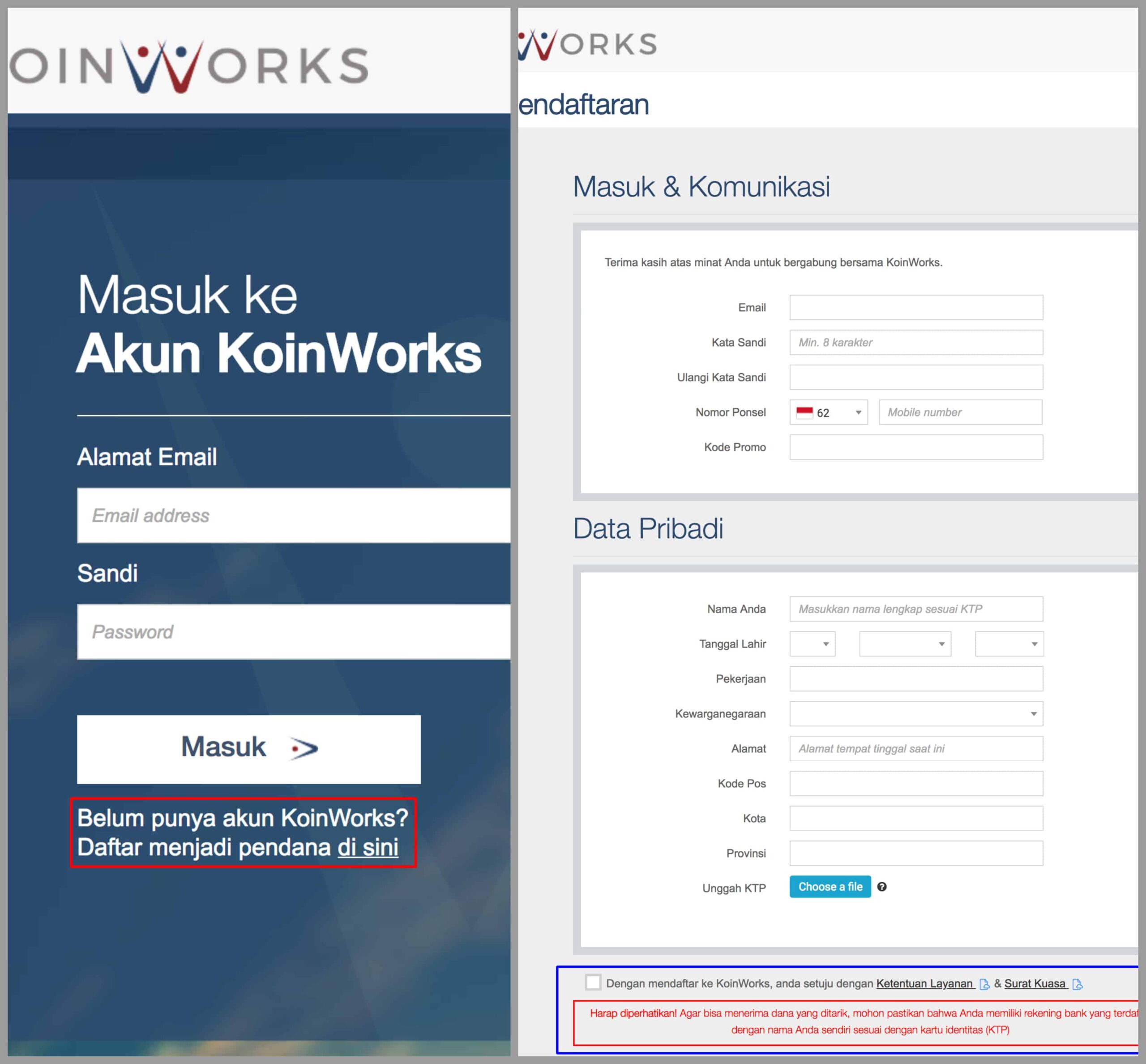 Proses pendaftaran Anda lakukan dengan Koinworks login ke https://koinworks.com/ dan mengisi data yang diperlukan.