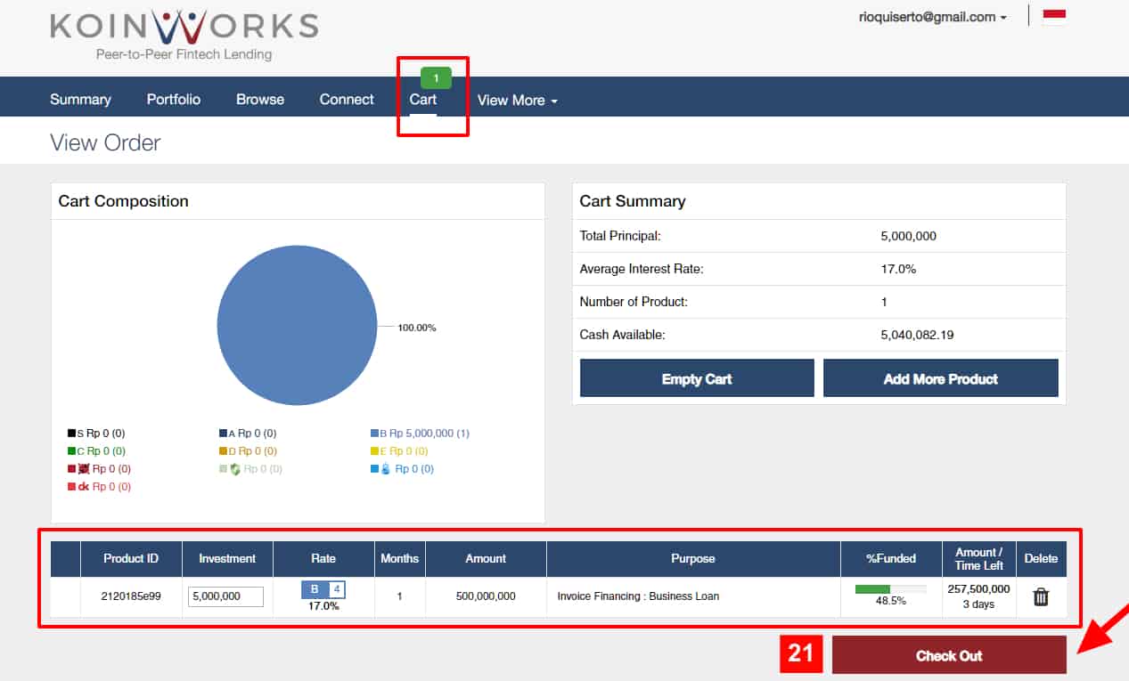 20. Di baris atas, ‘Cart’, muncul penanda Anda menempatkan investasi ke 1 pinjaman.